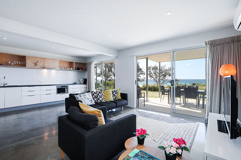 This beautiful apartment has amazing, stunning view of the Ocean. The view is breath taking. The sandy beach is directly in front of you. It is a 2 Bedroom fully self contained apartment with Kitchen, dining area, living area and has its own laundry facilities including a clothe dryer. There is also a large outdoor setting on the balcony of this apartment from which you have stunning Ocean views and it probably will be your favourite place to sit, relax and absorb the view. One bedroom has a queen size bed and the other bedroom has two single size beds. You cannot get any closer to the beach than this. We have two of this type of apartment, one is located on the ground floor and the other is located on the 1st floor.