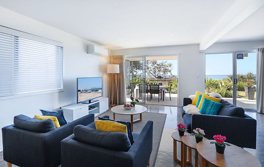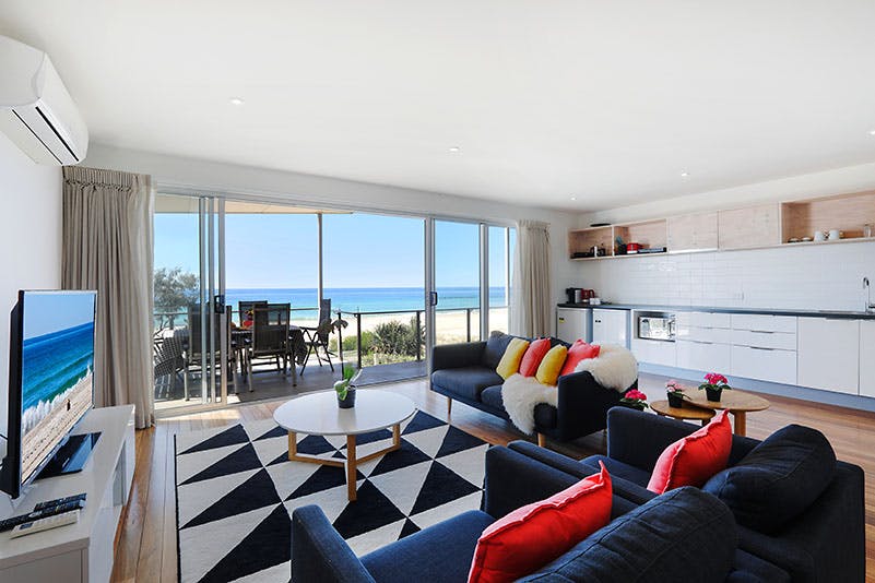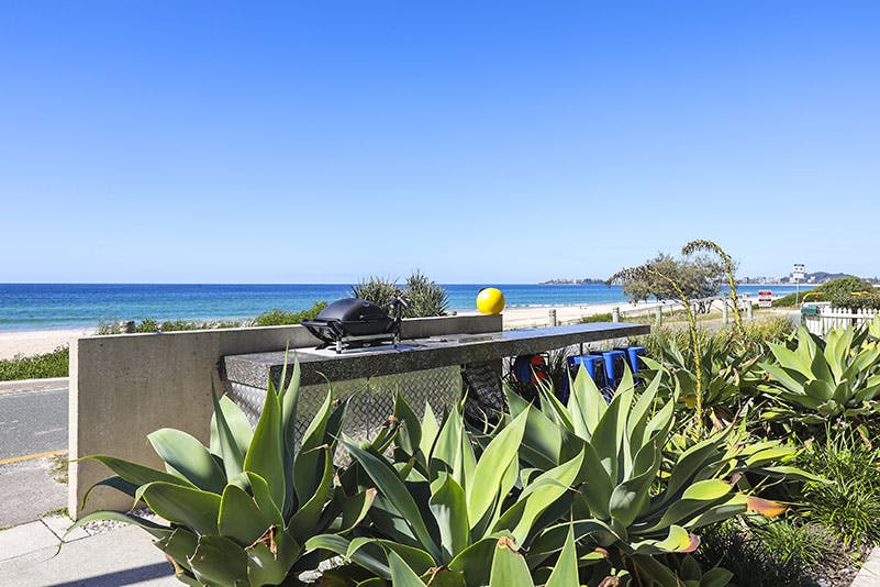 This beautiful apartment has amazing, stunning view of the Ocean. The view is breath taking. The sandy beach is directly in front of you. It is a 2 Bedroom fully self contained apartment with Kitchen, dining area, living area and has its own laundry facilities including a clothe dryer. There is also a large outdoor setting on the balcony of this apartment from which you have stunning Ocean views and it probably will be your favourite place to sit, relax and absorb the view. One bedroom has a queen size bed and the other bedroom has two single size beds. You cannot get any closer to the beach than this. We have two of this type of apartment, one is located on the ground floor and the other is located on the 1st floor.